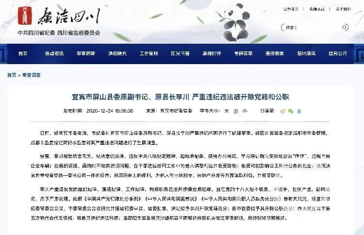 12月24日,四川省纪委监委公布,宜宾市屏山县原县长李川因职务违法并涉嫌受贿犯罪,被开除党籍和公职,案件移送检察机关审查起诉。四川宜宾屏山县委书记、县长在年初双双落马之后,案件再次引发了关注。