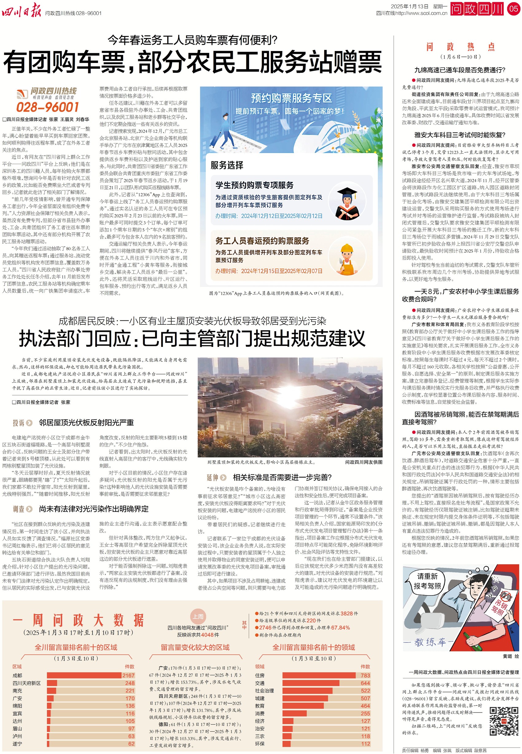 春节临近,抢购车票成为在外务工者的关注焦点。今年四川部分省市县驻外办事处、工会、共青团组织了务工者的团购车票活动,其中部分机构还开展了农民工服务站赠票活动。此外,四川将继续提供“春风行动”客车,方便外出务工人员往返于川内和外省市,同时开通“金通工程”小黄车等服务,解决返乡“最后一公里”。今日五版带来春运购票提示。