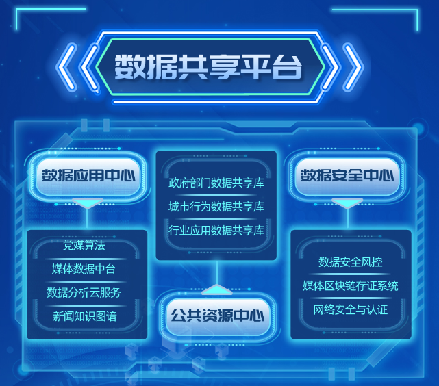 该平台由数据应用中心、公共资源中心、数据安全中心构成。数据应用中心通过数据驱动内容、用户、 营销、管理的增长和促进产品应用;公共资源中心整合政府部门数据资源、公共数据资源等;数据安全中心构成专注于效率与安全,对用户、内容、业务等数据提供安全防护和版权防护。