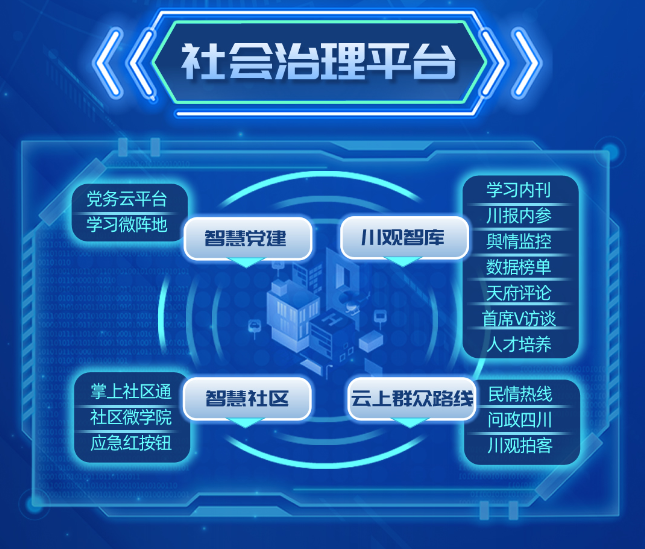 该平台由智慧党建、智慧社区、川观智库、云上群众路线4个模块构成,利用党媒优势整合民生、科技、教育、宣传、社会服务等优质资源,系统创新全媒体解决方案,加快基层社会治理智慧化进程。