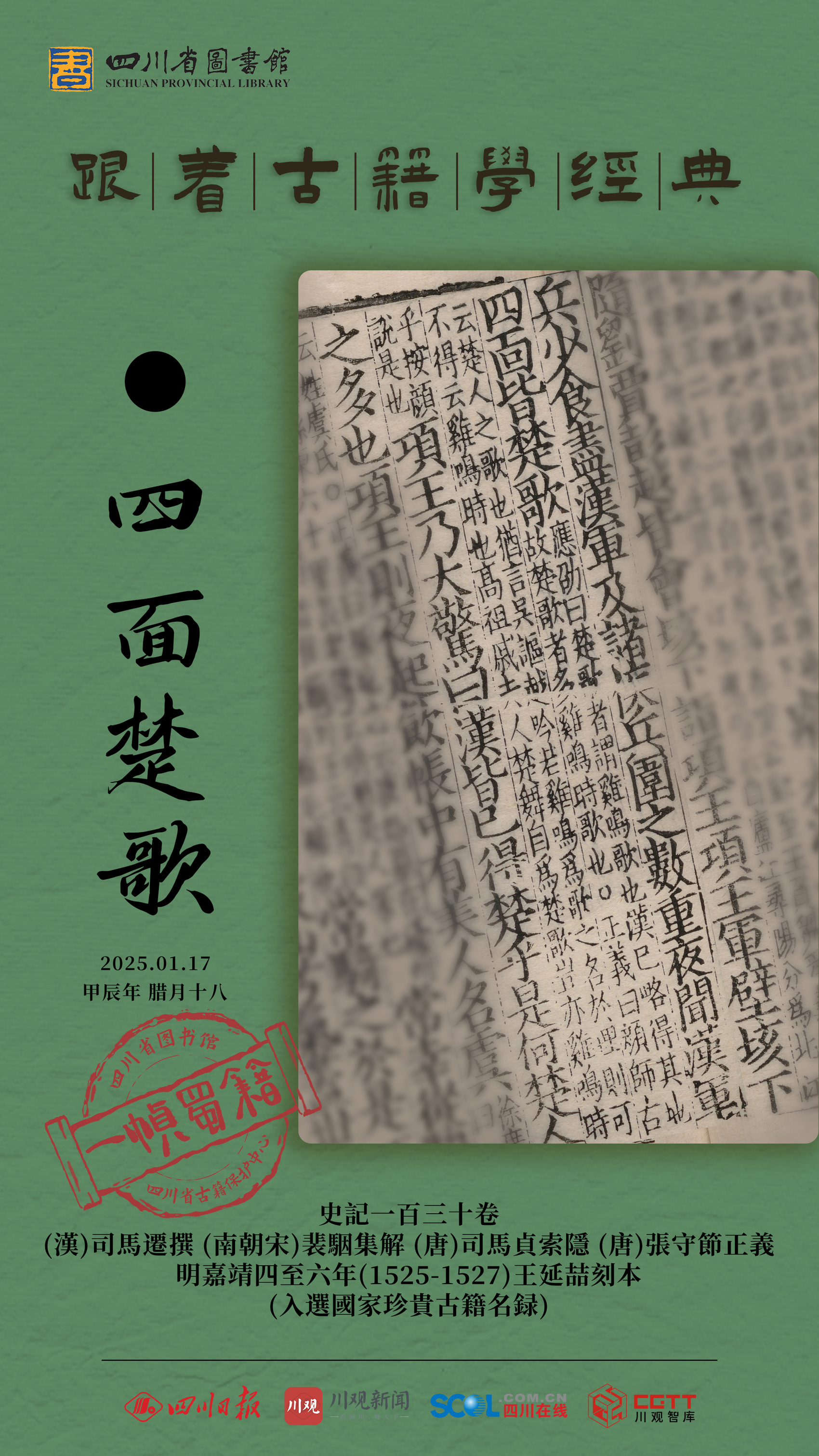 1月17日,一帧蜀籍邀您欣赏《史记》。海报所选用图为《史记》一百三十卷,(汉)司马迁撰(南朝宋)裴驷集解(唐)司马贞索隐(唐)张守节正义,明嘉靖四至六年(1525-1527)王延喆刻本(入选国家珍贵古籍名录)。
