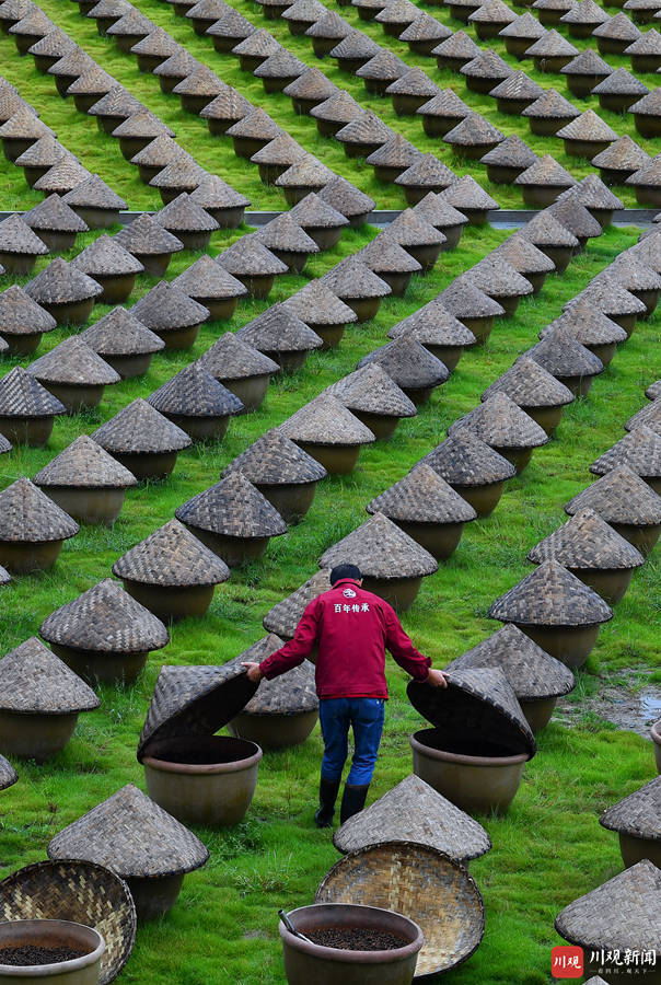 泸州市合江县佛荫镇酱油酿造坊晒露场,5万口晒露缸依次排列,工作人员在晾晒“五比一”酱油。