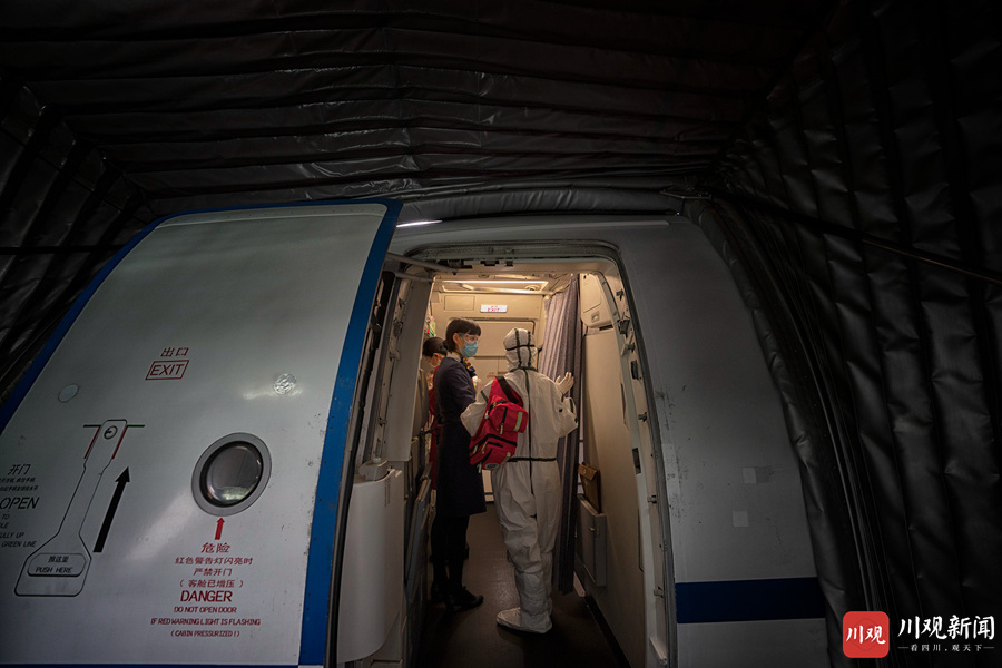 成都双流国际机场防疫医务人员登上刚落地的航班,防疫人员24小时守候岗位,严格把关。