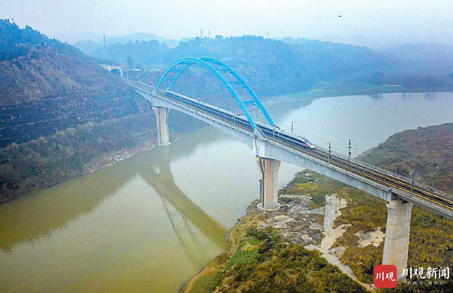 连接成都和重庆的成渝高铁首开复兴号动车组,列车最高运行时速也提高到350公里,实现成渝间高铁公交化运营1小时通达。图为G8607复兴号高铁驶过资阳市沱江特大桥。