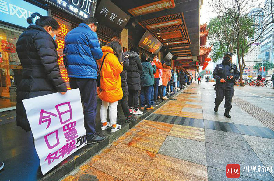 成都同仁堂,市民排队购买口罩,每人一次只能购买一包成人口罩和一包儿童口罩。3天后,该药店推出预约购买二维码。