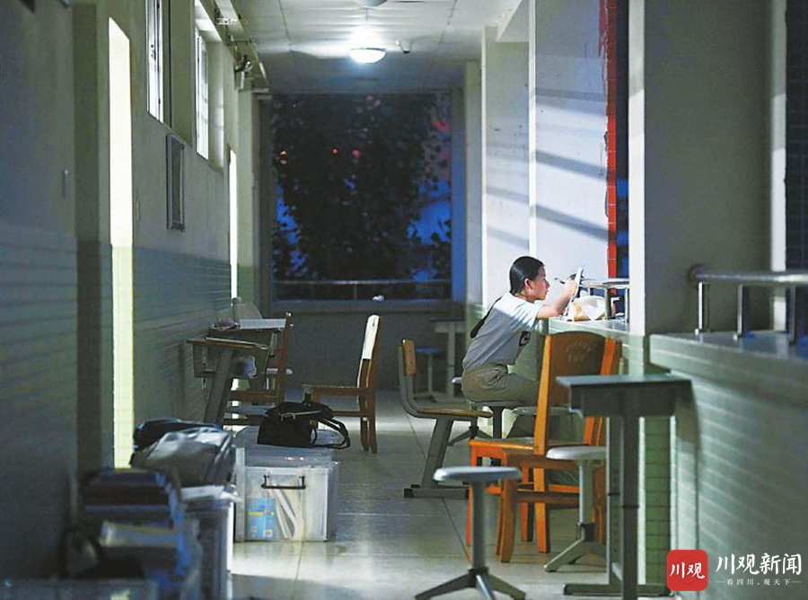 一位四川师大附中的高三学生在走廊里上考前最后一个晚自习。2020年高考延期一个月举行,考试时间为7月7日至8日。