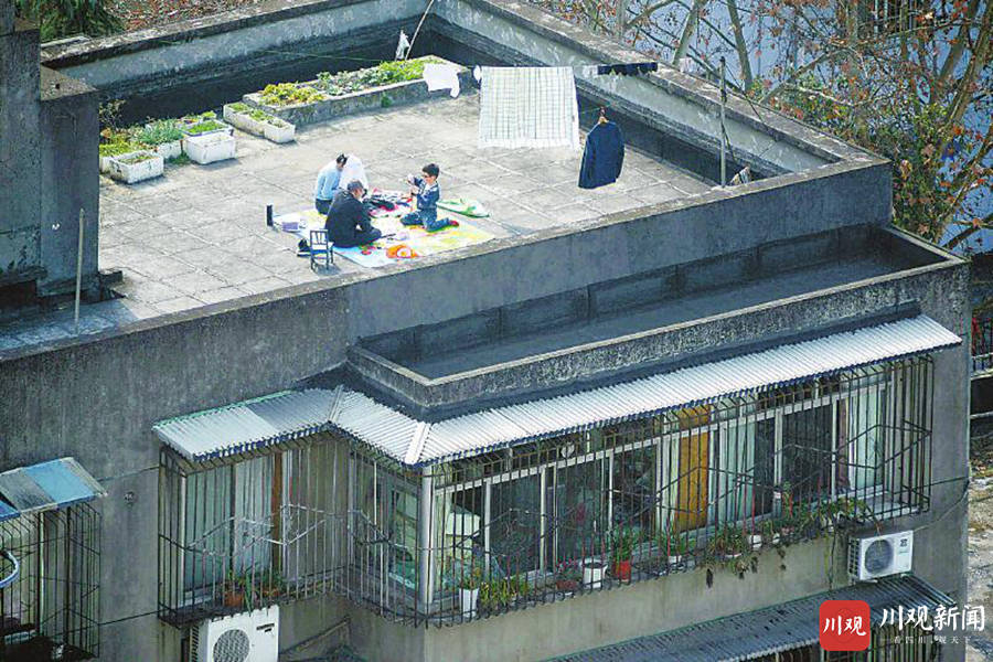 2月29日,成都一家人在屋顶享受阳光,他们因疫情“宅”在家。