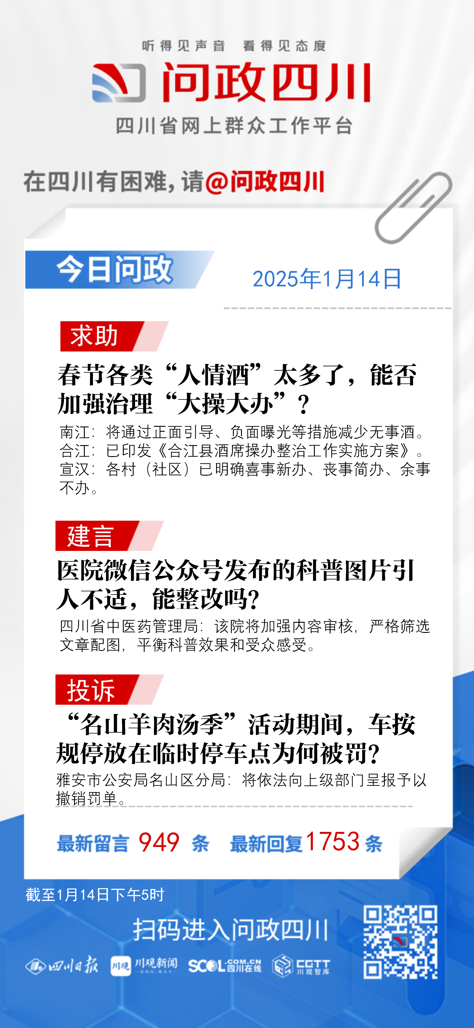 在四川有困难,找问政四川。如果您在四川遇到了操心事、烦心事、揪心事,请登录“四川省网上群众工作平台—问政四川”或拨打问政四川热线(028-96001)留言反映、求助或建议。我们将充分发挥平台的互动联系作用及舆论监督功能,第一时间传递民声,推动问题得以及时解决——听得见声音,看得见态度。