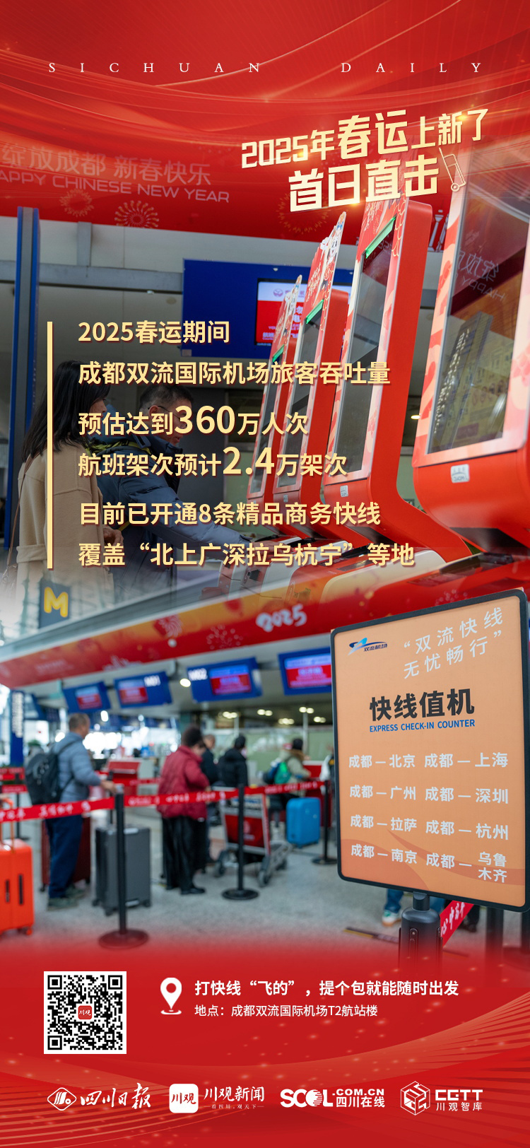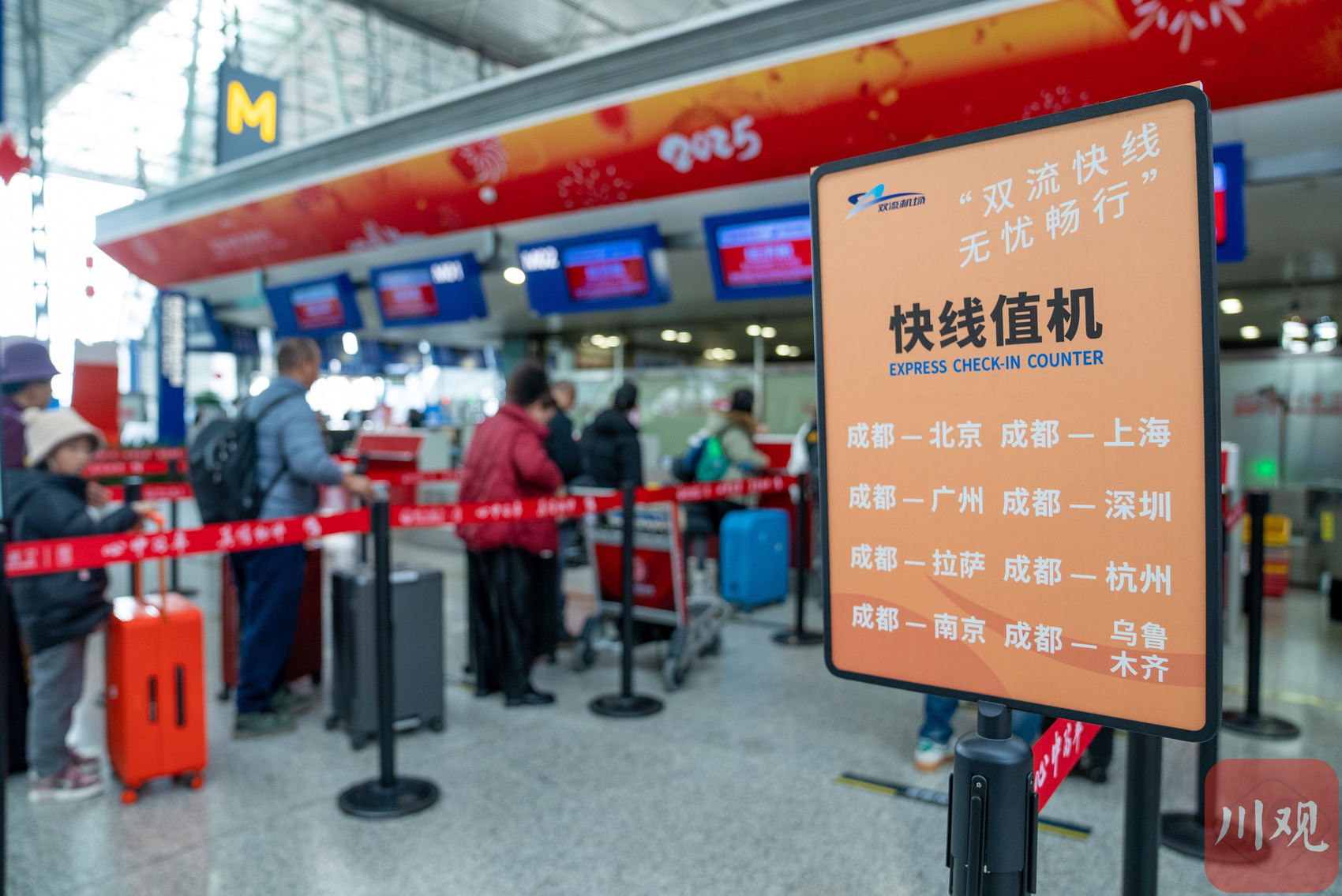据相关部门预测,2025年春运期间,四川民航总客运量将达到1285.3万人次,较2024年春运增长10%,较平时增长29.4%。记者了解到,为了满足更多旅客的出行需求,部分航司已加密、增开成都双流至“北上广深拉乌杭宁”的多条精品商务快线。例如,川航已经打造了8条核心快线,覆盖北京、广州、上海等重点城市。春运期间,将重点加密成都双流至北京、广州和深圳等城市的航班频次,确保在双流机场每天四班以上的快线达到5条。