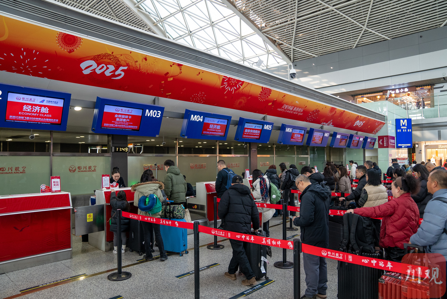 2025年春运首日,双流机场旅客排队值机,等候出行。