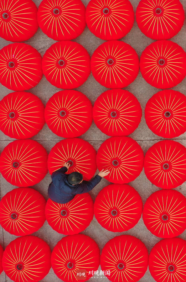 成都市金堂县金龙镇,工人正在晾晒灯笼,每年有超过500万个这里制作的灯笼卖到全世界。