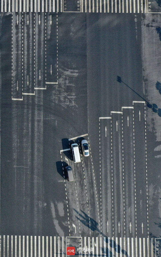 成都市天府大道上等待左转的汽车,受疫情影响昔日车来车往的城市主干线上车辆大幅减少。
