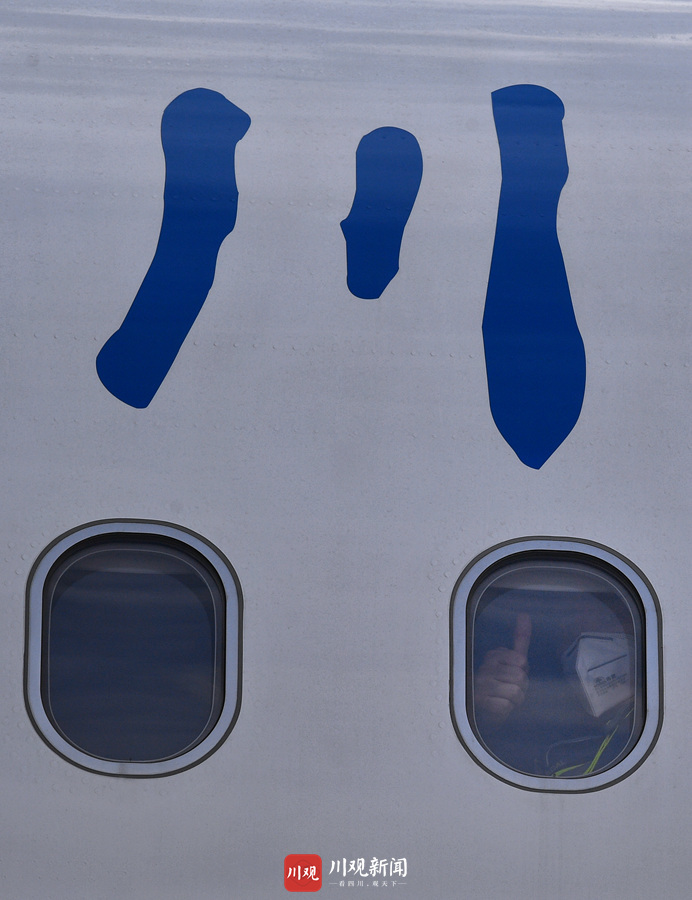 一名援助湖北医疗队队员向机窗外送行人员竖起大拇指,当日四川省第六批援助湖北医疗队303名医护人员从双流机场出发。