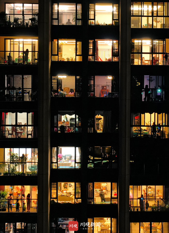成都市天誉小区居民在阳台上唱歌,在“家里蹲”时期成都多个小区自发举办抗疫主题大合唱。