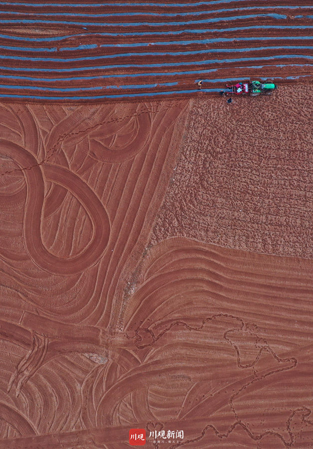 凉山州布拖县,现代农业产业园内工人用机械方式栽种马铃薯。