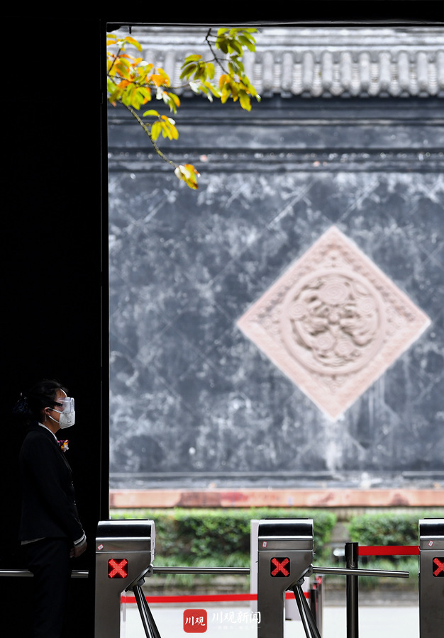 成都市武侯祠博物馆的工作人员等待游客到来,当日馆内的文物区恢复对外开放。
