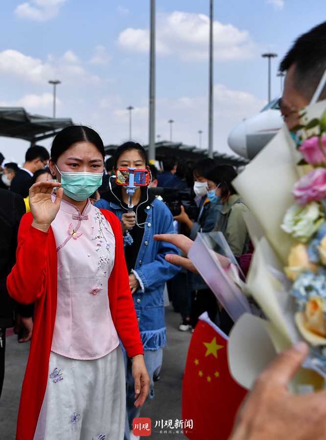 成都双流机场停机坪,一袭红衣的省医院护士吴婷含着热泪与丈夫隔空挥手致意,当日四川援助湖北医疗队第四批撤离队员共117人平安返川。