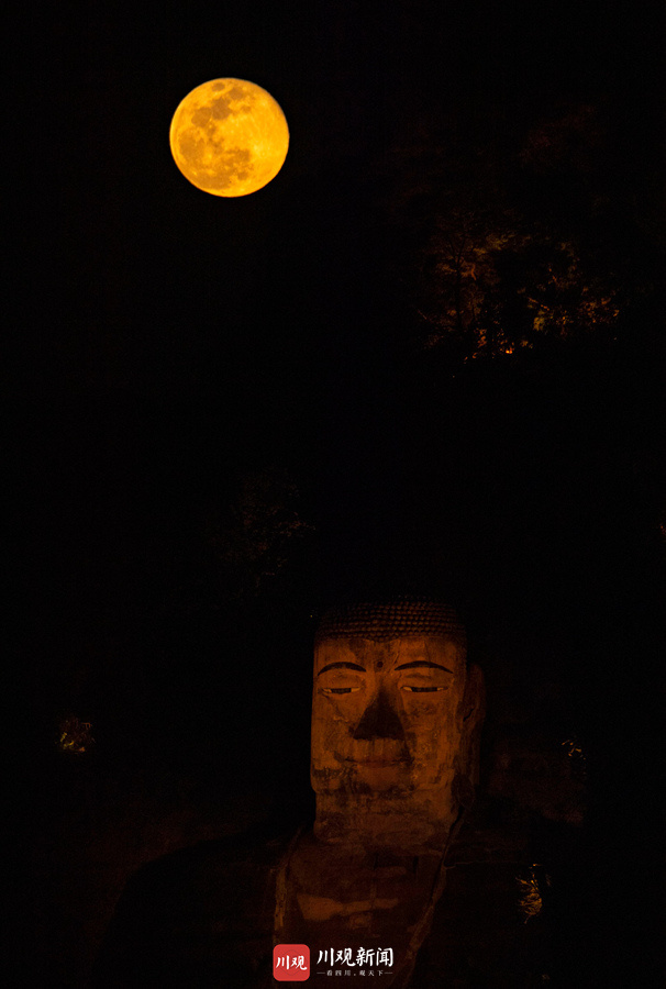 2020年最大、最亮的“粉红满月”悬在乐山大佛头顶。