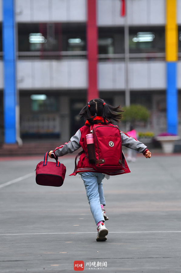 乐山市实验小学,一名小学生跑步进入阔别80多天的校园,全省学校复课逐步实行。