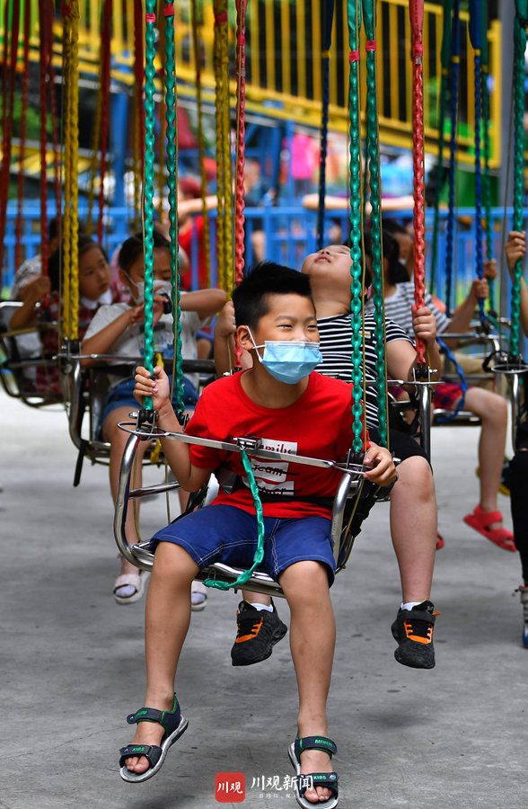 戴着口罩的孩子们在成都市人民公园内玩耍过节。