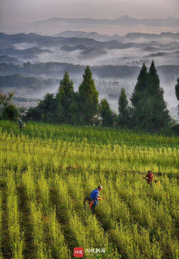 达州市渠县望江乡武坪村,村民在黄花地中采摘鲜花。