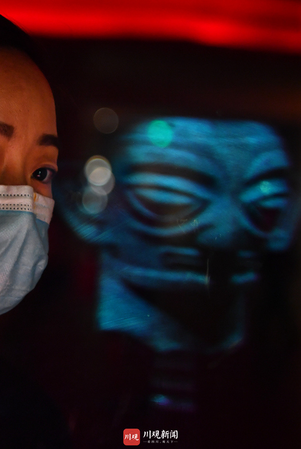 游客正在参观三星堆青铜面具,暑假期间旅游也得到恢复。