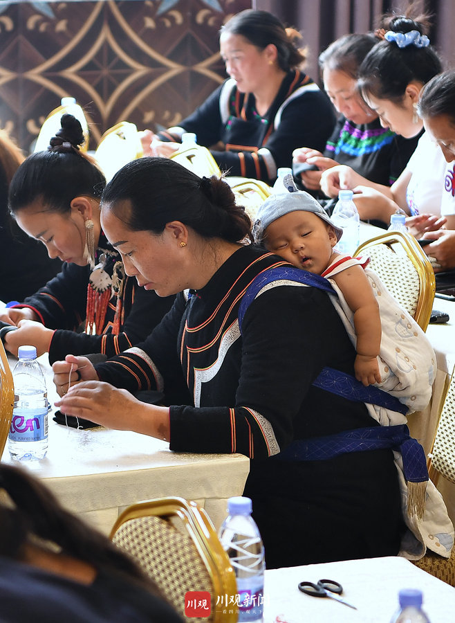凉山州雷波县,惹格阿作在彝绣培训班中学习,背上的孩子已经熟睡。