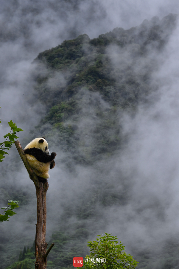 中国保护大熊猫保护研究中心神树坪基地,一岁的大熊猫雅雅在树上休息。