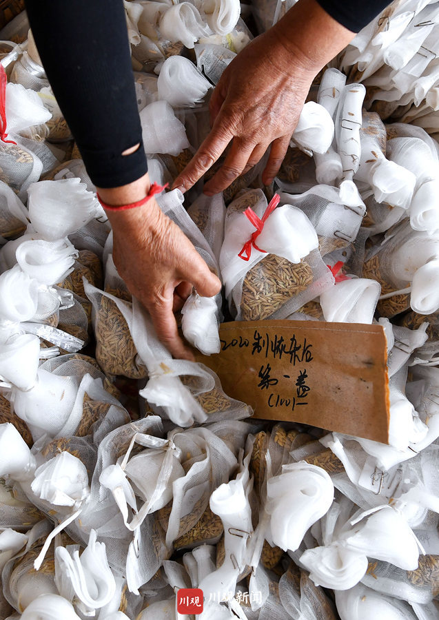 四川省农科院水稻高粱研究所德阳科研基地,装袋完成的水稻组合摆放一起。