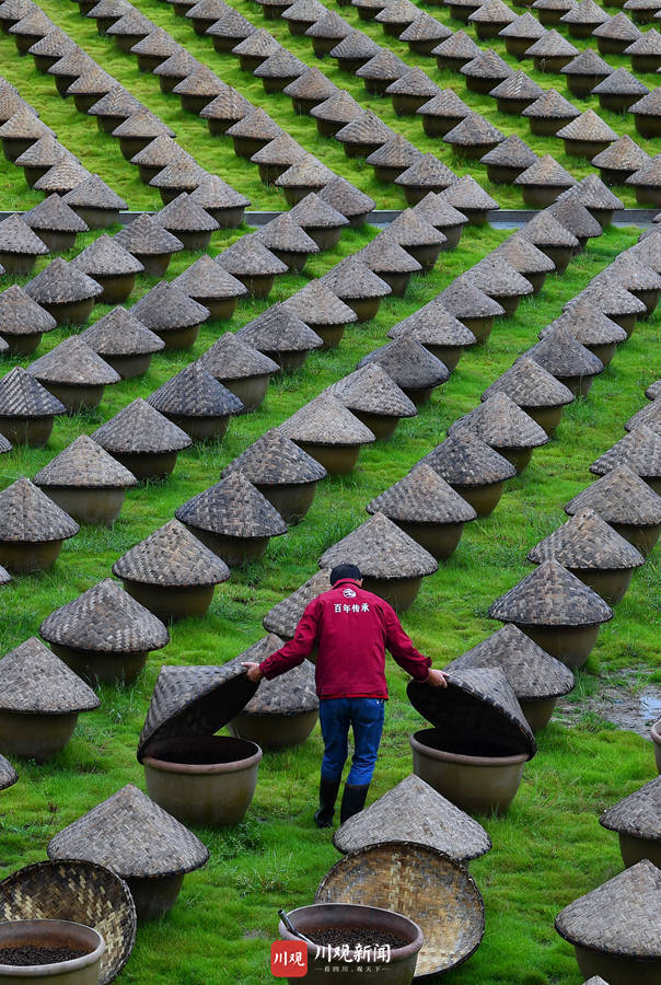 泸州市合江县佛荫镇酱油酿造坊晒露场,5万口晒露缸依次排列,工作人员正在晾晒“五比一”酱油。