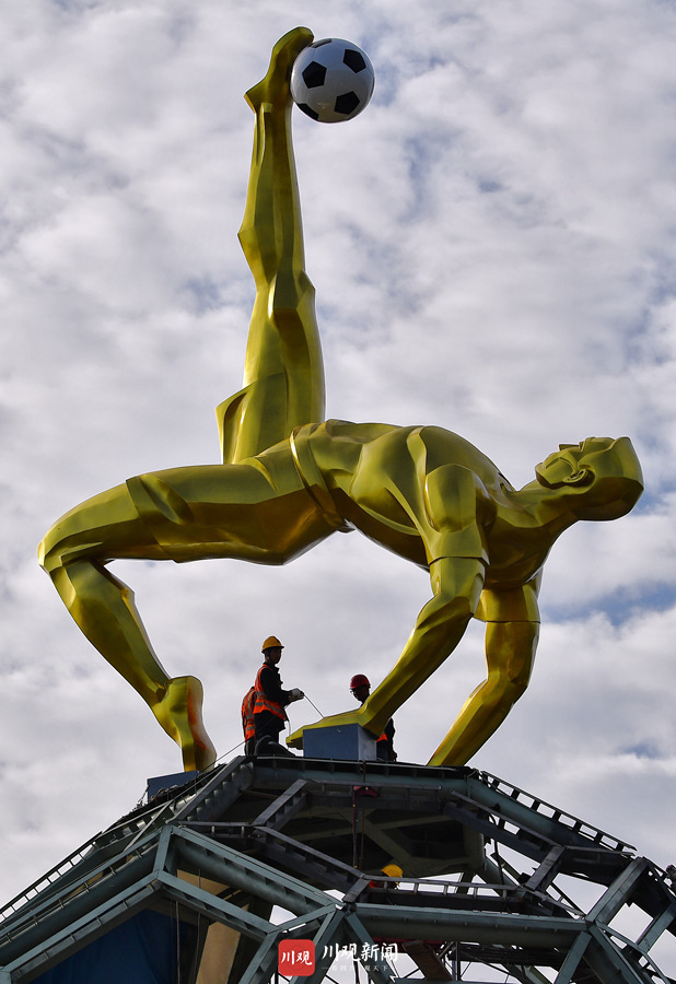 内江市威远县连界镇,中国·连界足球竞训基地内工人安装足球主题雕塑。