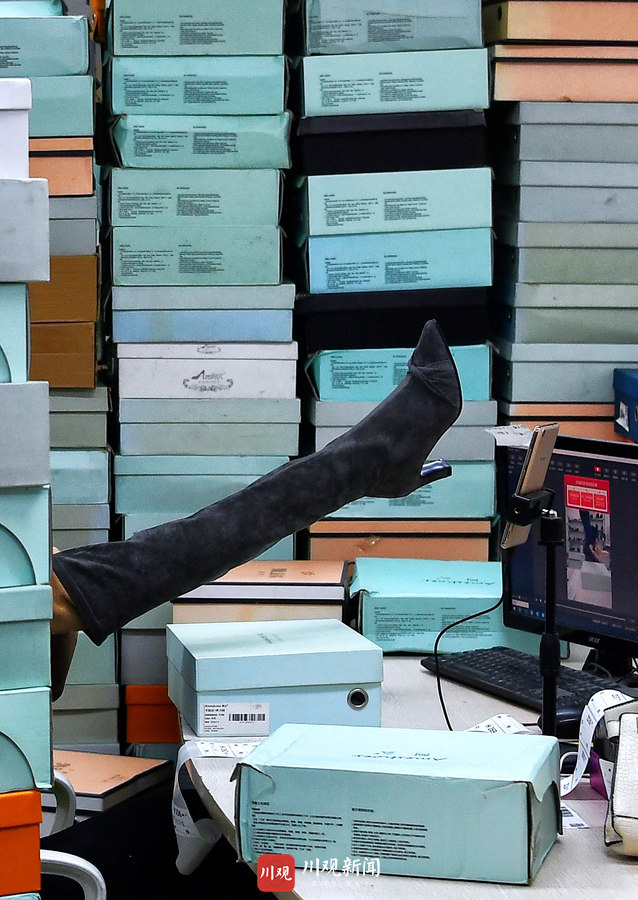 成都市阿么集团的直播间内,双十一期间一名男主播正在展示女靴。