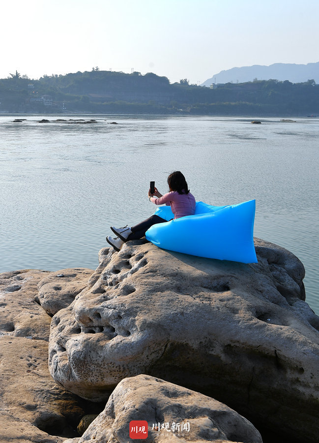 泸州市江阳区,市民坐在充气沙发中拍摄长江景色。
