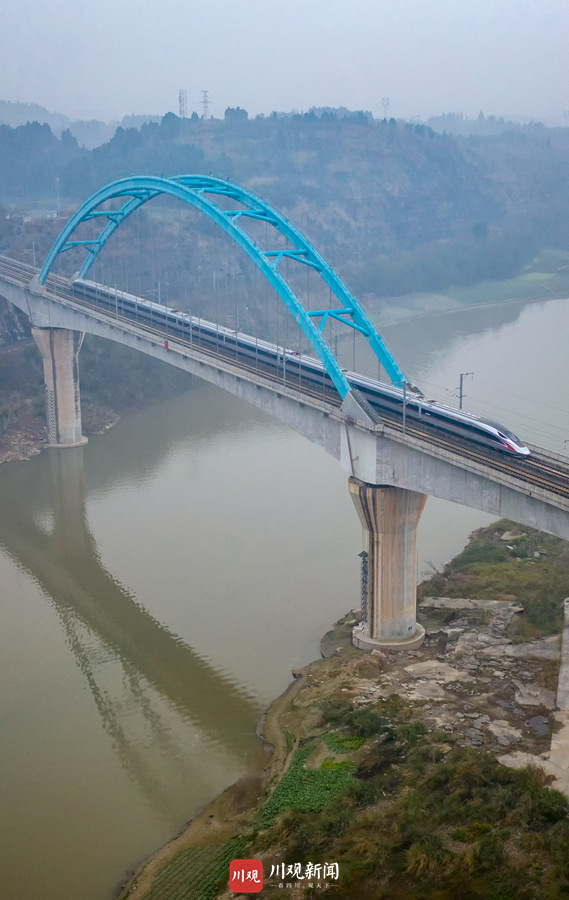 成渝高铁首列时速350公里的复兴号驶过资阳市沱江特大桥,成渝双城经济圈正式开行1小时直达列车。