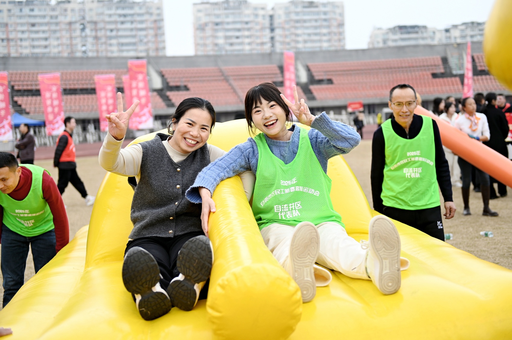 “加油!加油……跑快些……”1月15日下午,在自贡市南湖体育文化中心,2025年自贡市农民工新春趣味运动会热闹举行。场上,选手们奋力拼搏勇争第一,场下观众呐喊声夹杂着欢笑声,现场成了一片欢乐的海洋。
