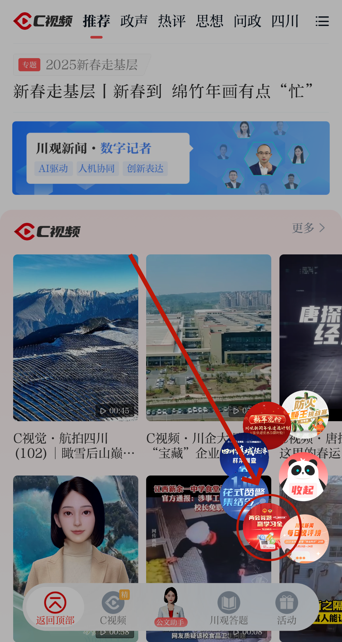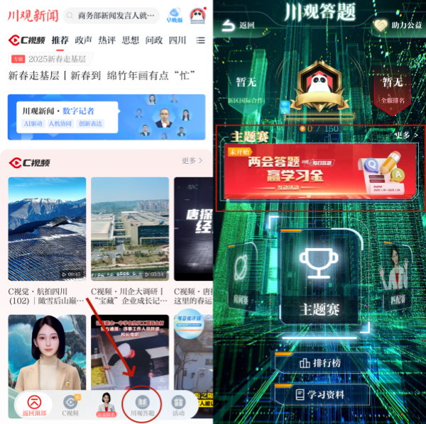 在川观新闻首页,点击下方“川观答题”,找到“两会答题赢学习金”互动活动图片点击参与活动即可参与;