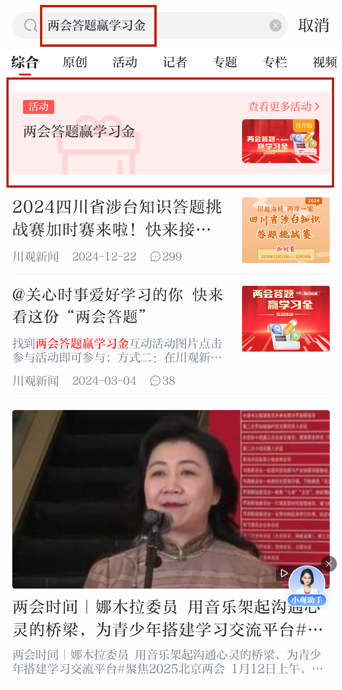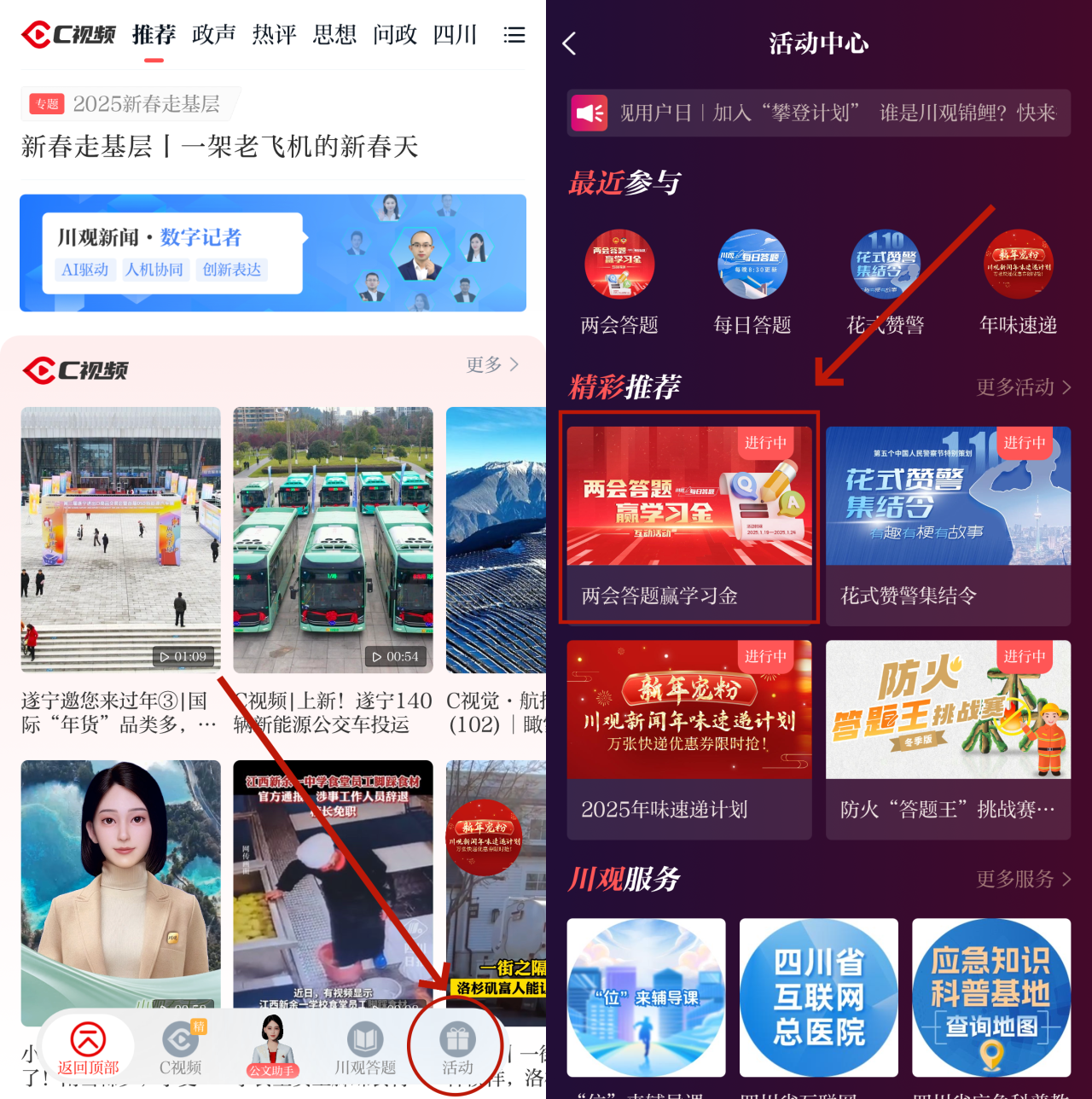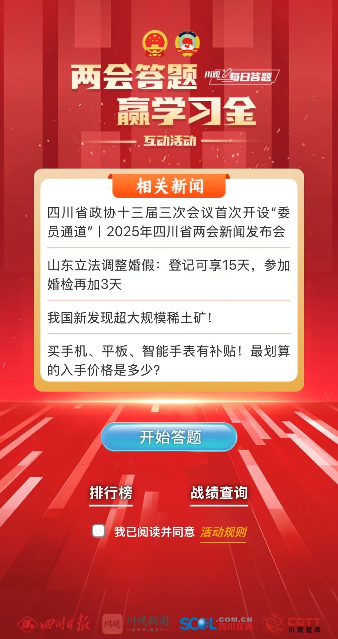 在川观新闻首页顶部搜索框输入“两会答题赢学习金”,点击活动链接即可参与。