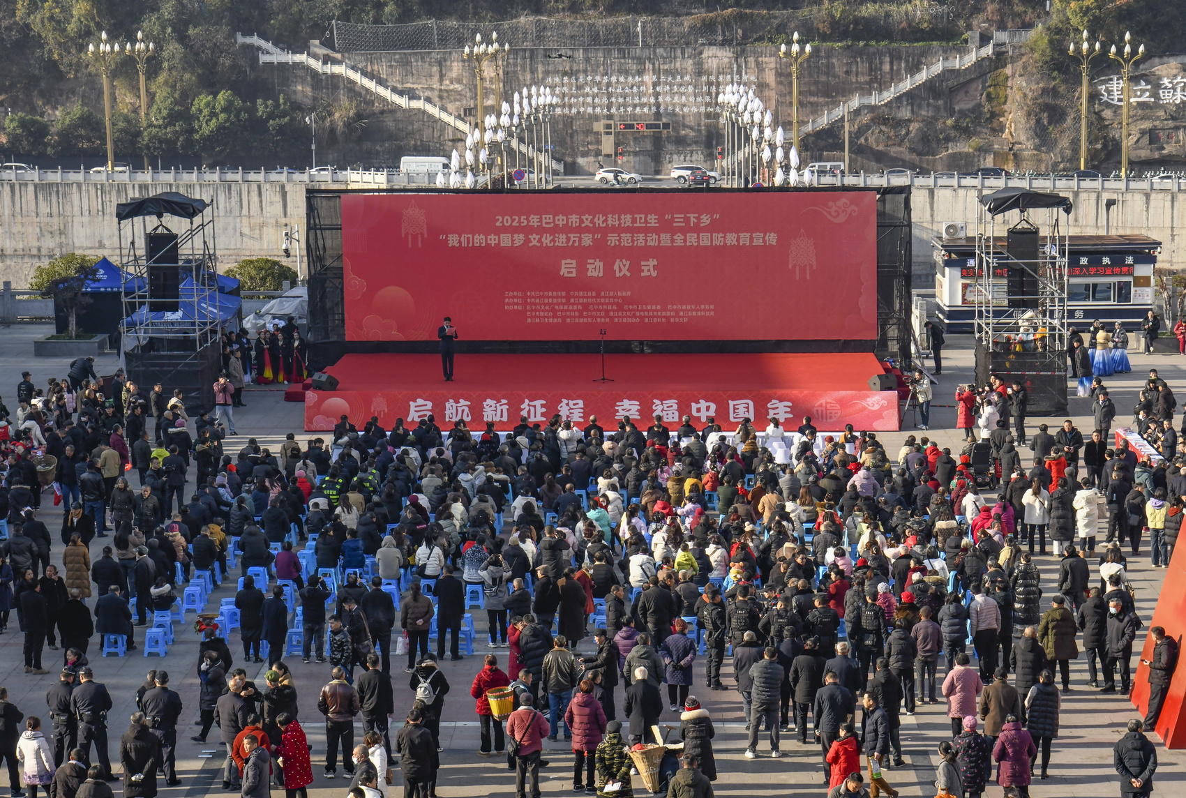 1月16日,2025年巴中市文化科技卫生“三下乡”“我们的中国梦 文化进万家”示范活动暨全民国防教育宣传启动仪式在通江县红军广场举行。