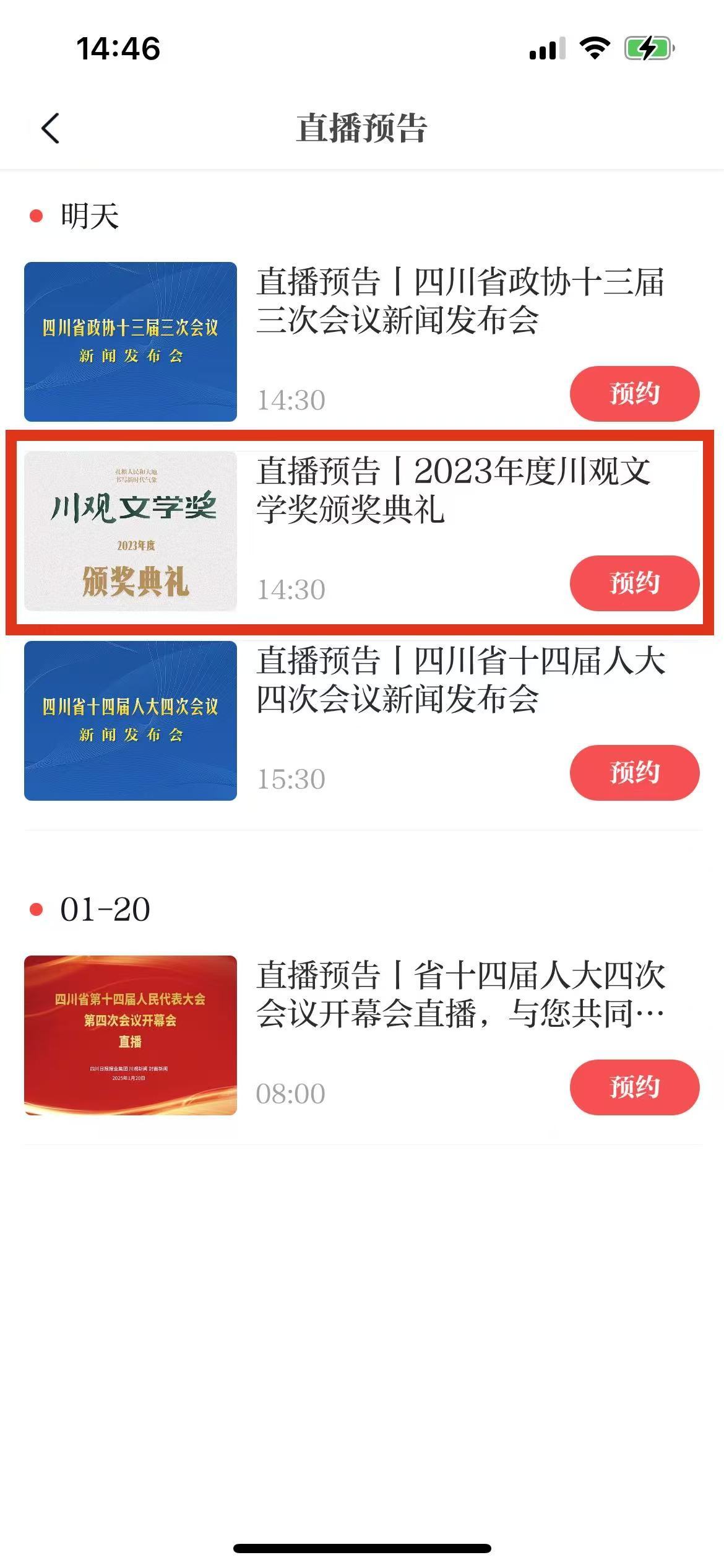 读者可在川观新闻直播频道,预约观看2023年度川观文学奖颁奖典礼直播。预约方式如下↓