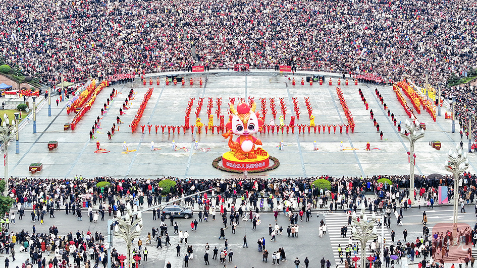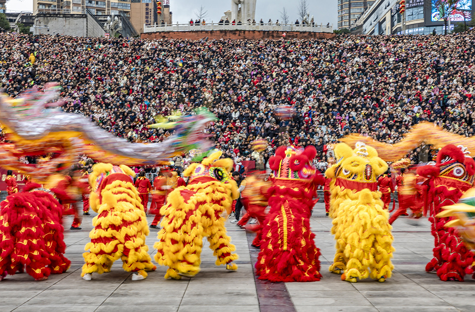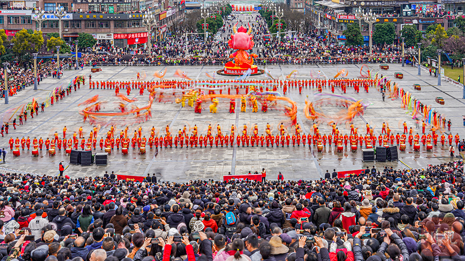 2024 年 2 月 24 日(正月十五),合江县在荔枝文化广场举办传统非遗文化元宵节展演活动,城区群众现场观摩舞龙舞狮表演。