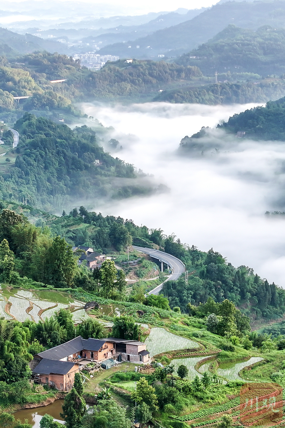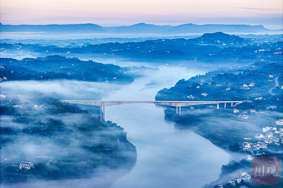 2024年6月30日,合江县赤水河畔云雾缭绕,与山丘、丛林、村庄、桥梁相映融合,如诗如画。