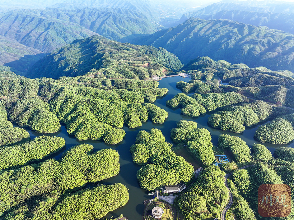 2024年5月22日,合江县福宝林场万亩楠竹迎风摇曳,美丽的琴蛙湖宛若一颗璀璨的绿宝石镶嵌其间,美轮美奂。