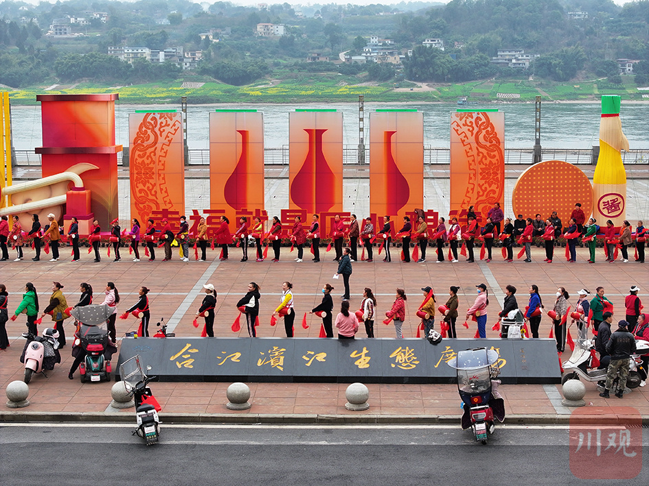 2024年2月21日,合江县滨江路音乐广场,市民大排练腰鼓节目。