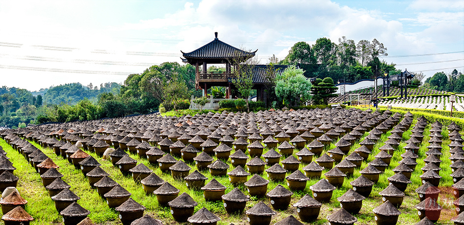 拥有10万口瓷缸的合江县五比一酱园厂一角,酱缸犹如围棋列阵,整齐划一。