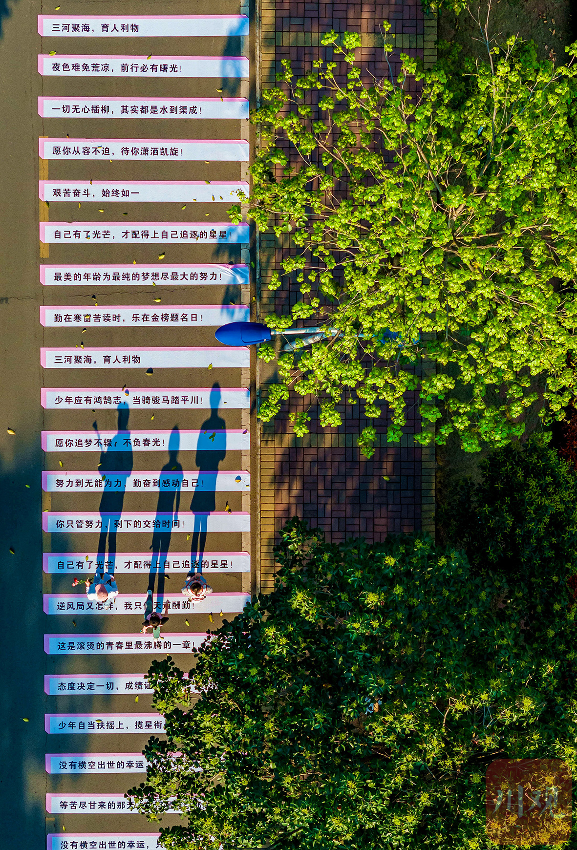 合江县三河职业学院绿树成荫,三名学子在阳光下沿校园路径漫步,投影与励志语相映成趣。