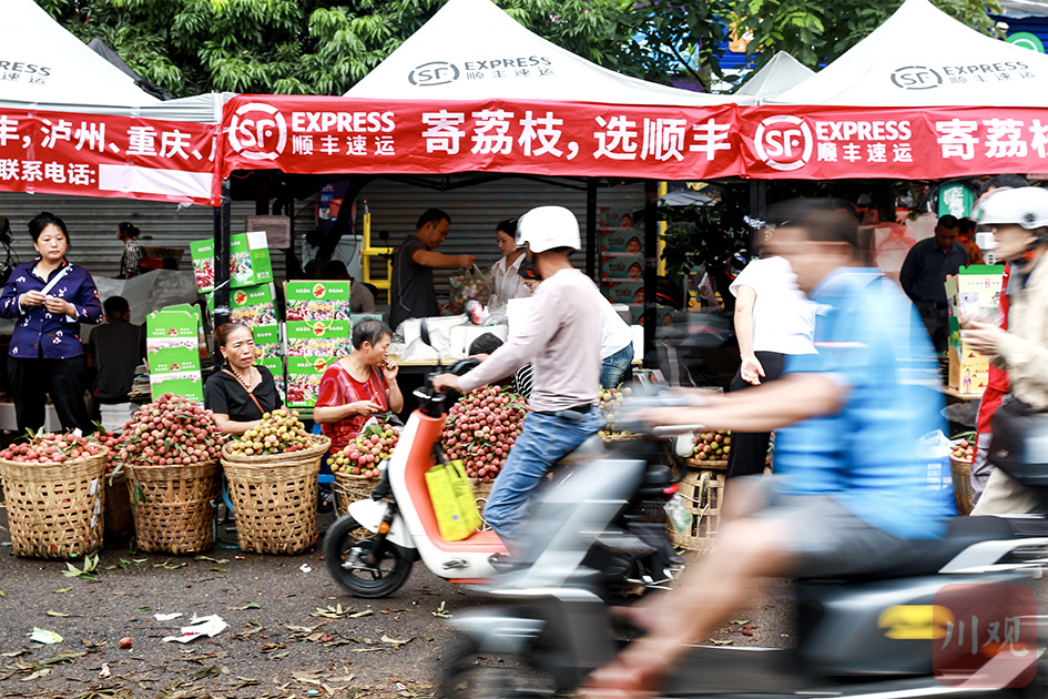 2024年7月12日,合江县马街荔枝交易市场,人来车往,交易繁忙。