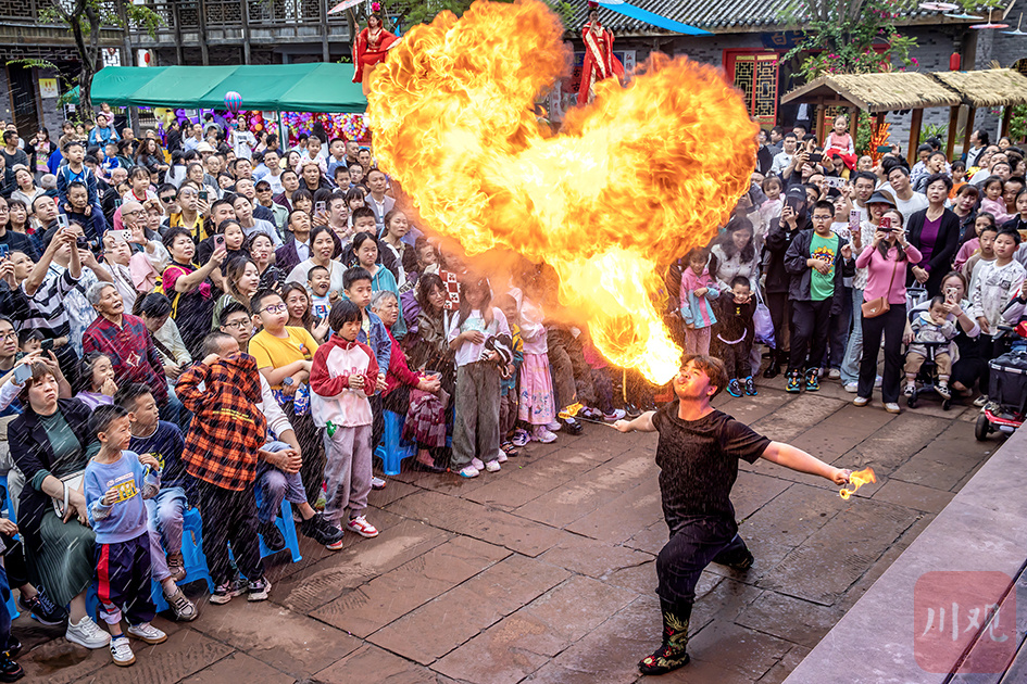 2024年10月3日,合江县尧坝古镇宋潮非遗节,川剧吐火表演吸引游客驻足观看。