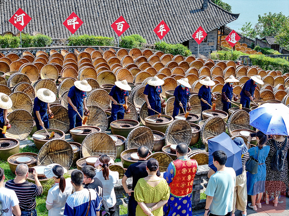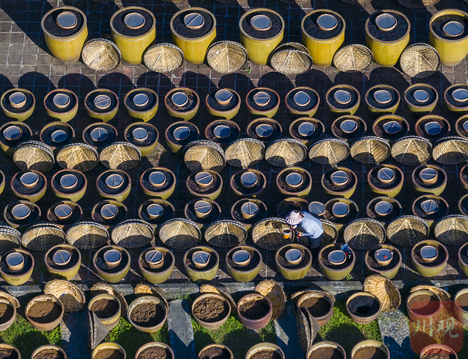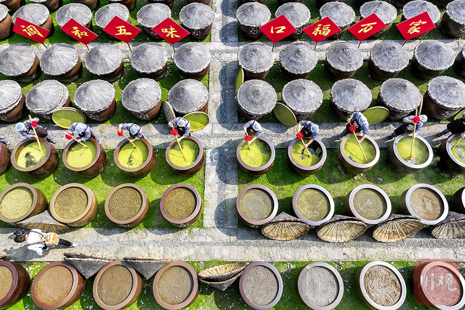 合江县先市古镇国家级非遗传承基地先市酱园内,酿造工人顶着高温正在按传统工艺进行酱油酿晒作业。