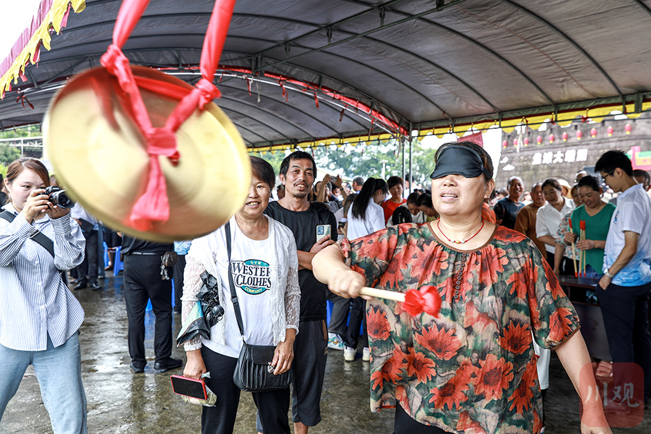 2024年6月20日,农历五月十五日,合江县焦滩大端阳民俗活动激情上演,当地群众在参加民俗活动蒙眼打锣。