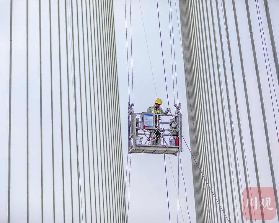 合江县榕山长江大桥进入工程收尾阶段,工人正在进行高空作业。